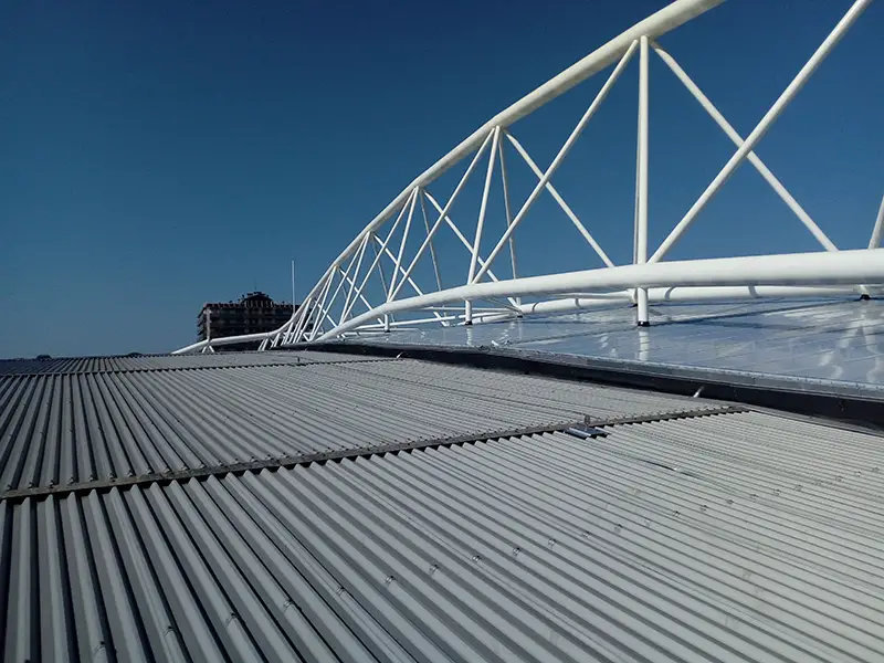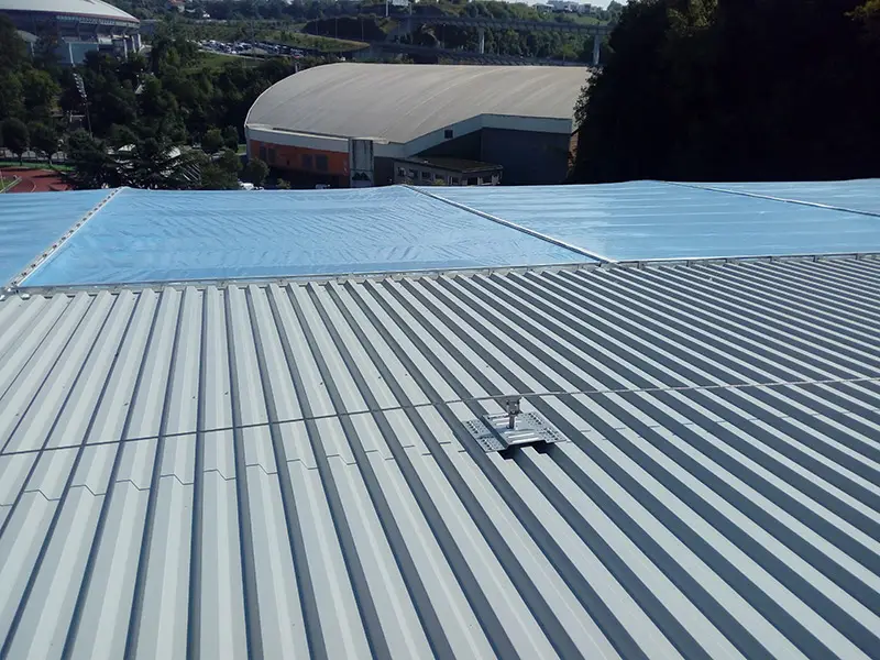 Instalación de líneas de vida all in one de Innotech en la cubierta metálica del renovado Campo Reale Arena de la Real Sociedad de San Sebastián. Fijación de chapas AIO SAND-13 directamente a cubierta metálica.