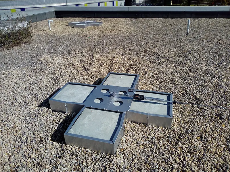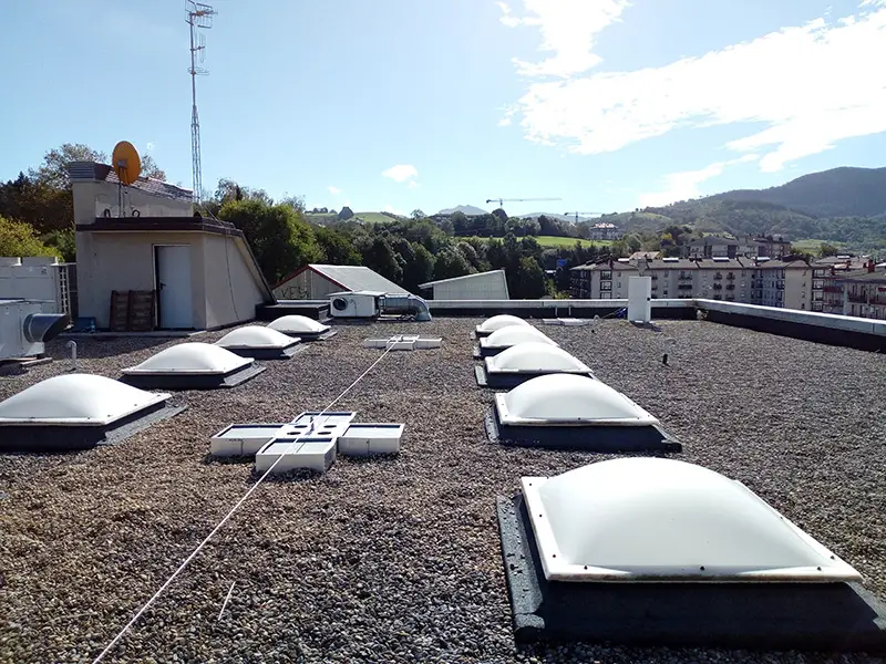 Instalación de línea de vida «Vario» all in one de Innotech en la cubierta plana de grava del ambulatorio y euskaltegi de Lasarte. Montaje con sistema contrapesado «Vario» evitando perforación alguna en cubierta sellada de tela asfáltica.
