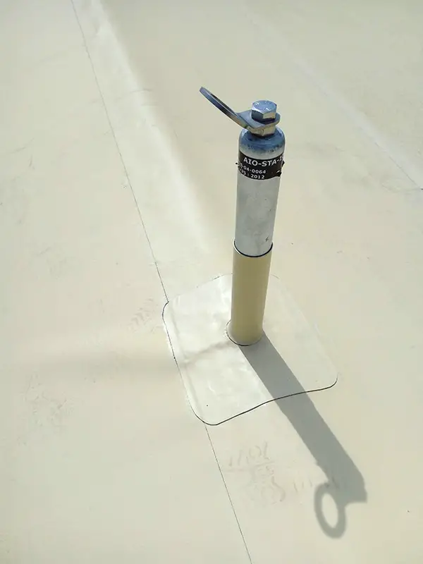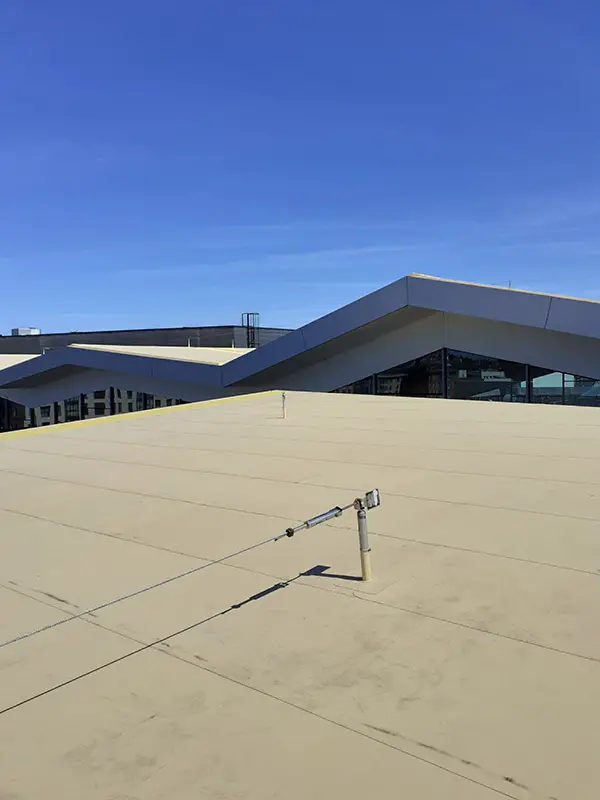 Instalación de líneas de vida en cubiertas del Centro comercial Ballonti de Portugalete en la reforma de las mismas. Instalación de postes AIO STA fijados a estructura metálica interior de cubierta para la instalación de línea de vida horizontal all-in-one de Innotech.
