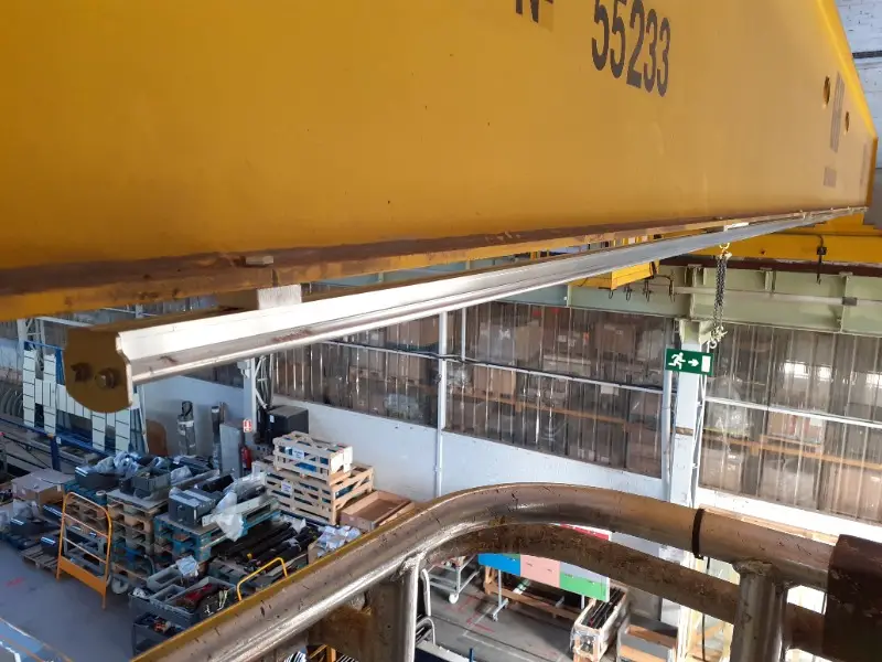 Instalación de línea de vida overhead en formato rail de aluminio Taurus de Innotech, instalado y fijado bajo puente grúa existente en la nave industrial. Todo ello para crear una seguridad anticaídas sobre cabeza en las labores a realizar en cualquier ubicación comprendida bajo el ancho y recorrido que abarque el puente grúa. Para la utilización del mismo se llevará a cabo el protocolo de consignación del puente grúa a utilizar y colindantes mientras dure la operativa. Utilización del sistema con carro «TAURUS GLEIT -H-11» y retráctil anticaídas de 7 metros.