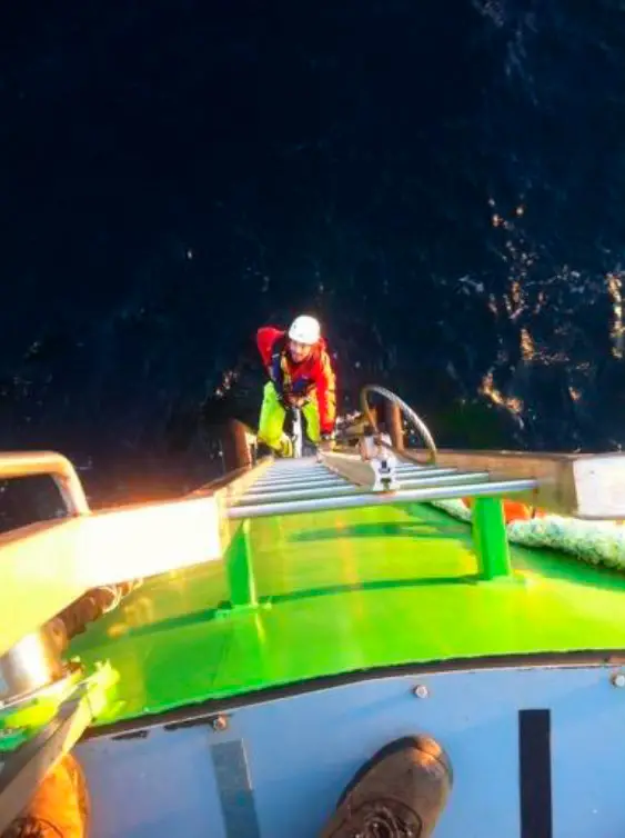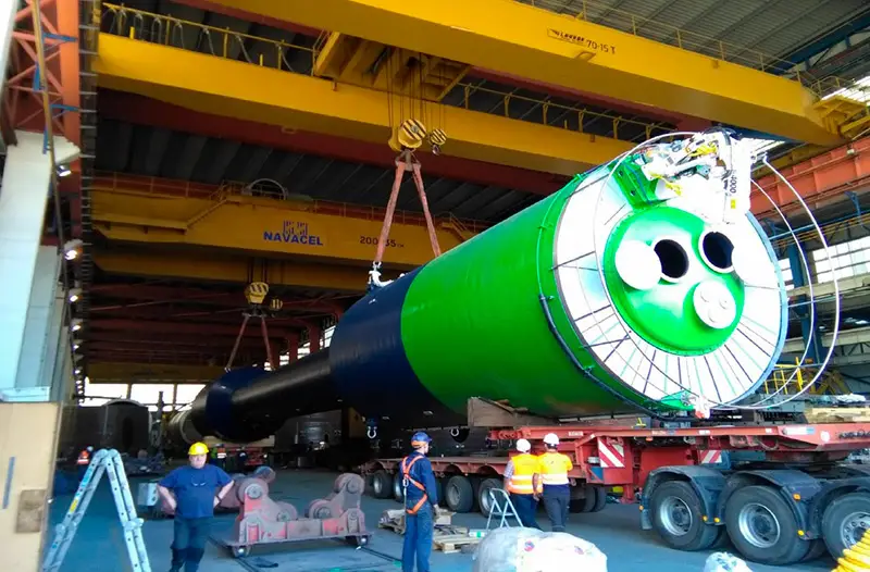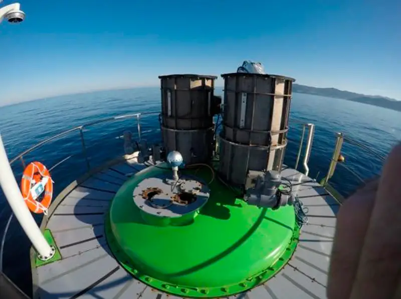 Proyecto de boya marina para la creación de energía de olas. Seguridad anticaídas en formato de barandilla circular perimetral y escalera de acceso en acero inoxidable A4 a medida con línea de vida vertical VERT ENDS-50 de Innotech.